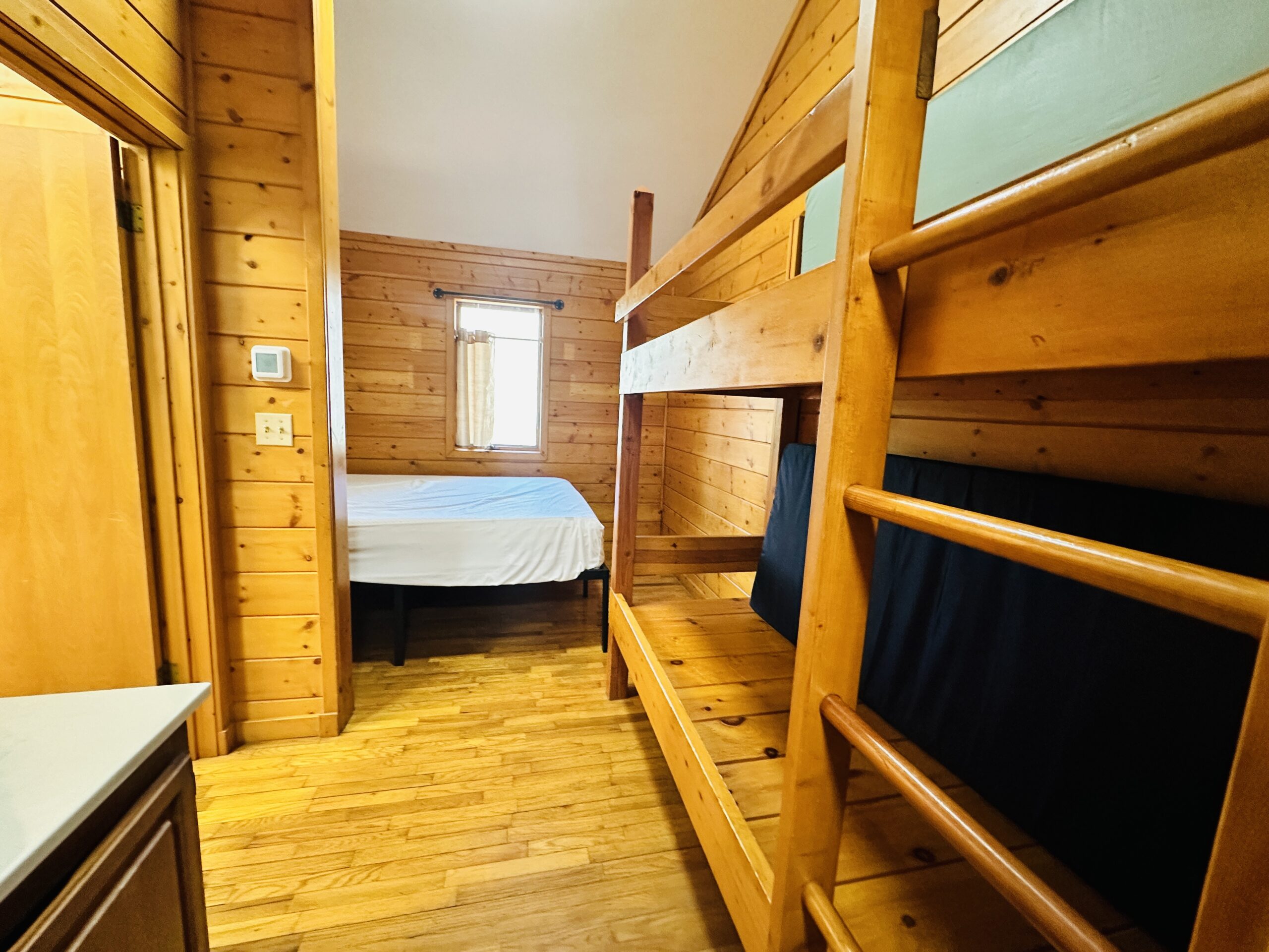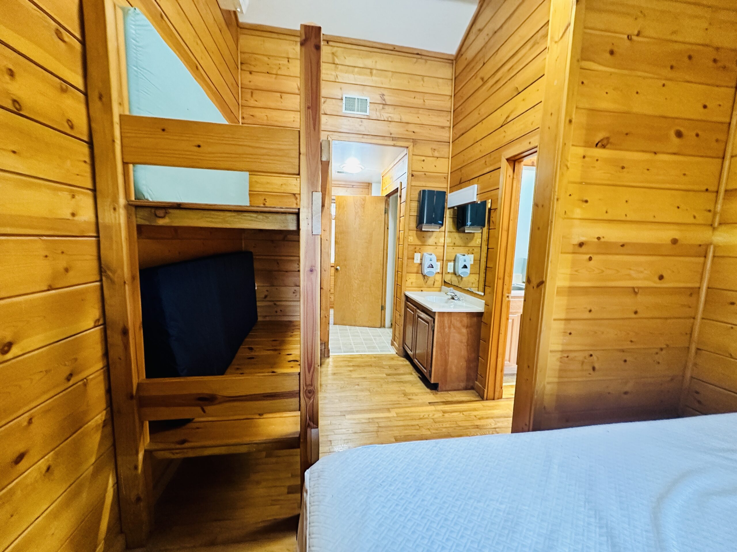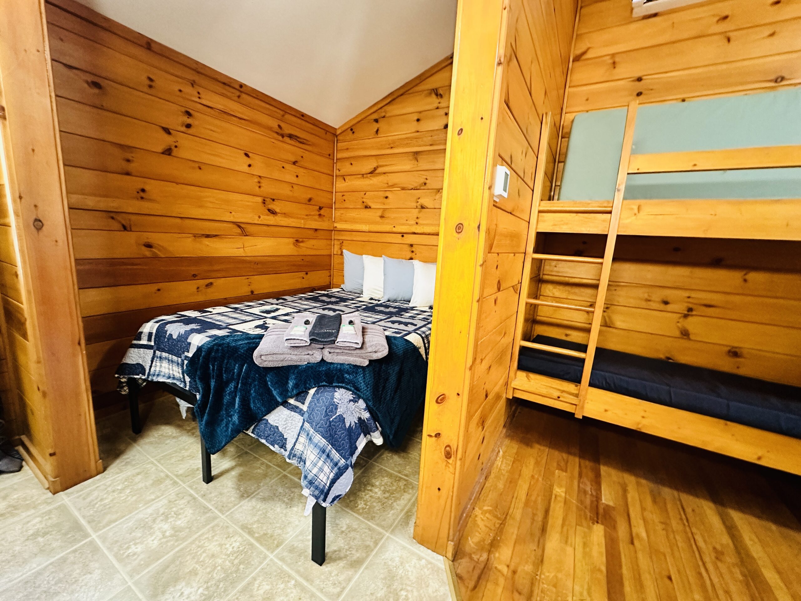 Deluxe Cabins sleep 8 total guests, 6 guests on single bunks in one bedroom and 2 guests on a queen-sized bed in second bedroom.  Bedding/Linens and Towels Included for Queen Bed