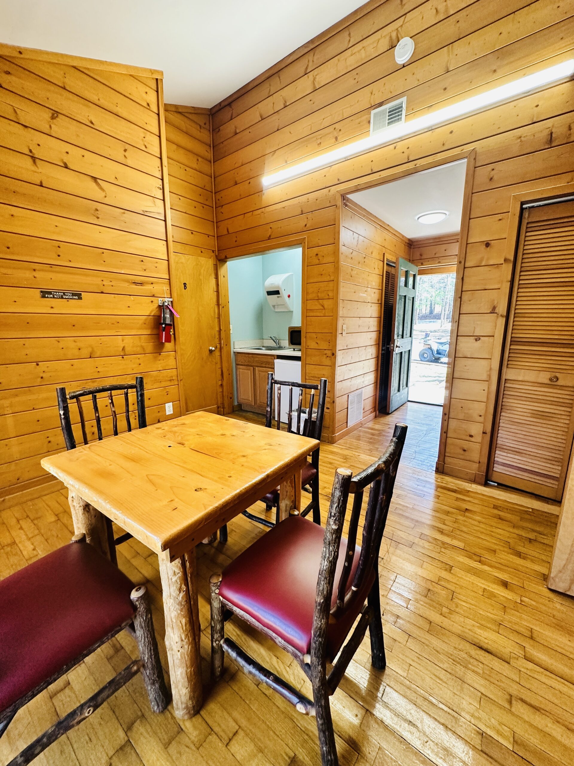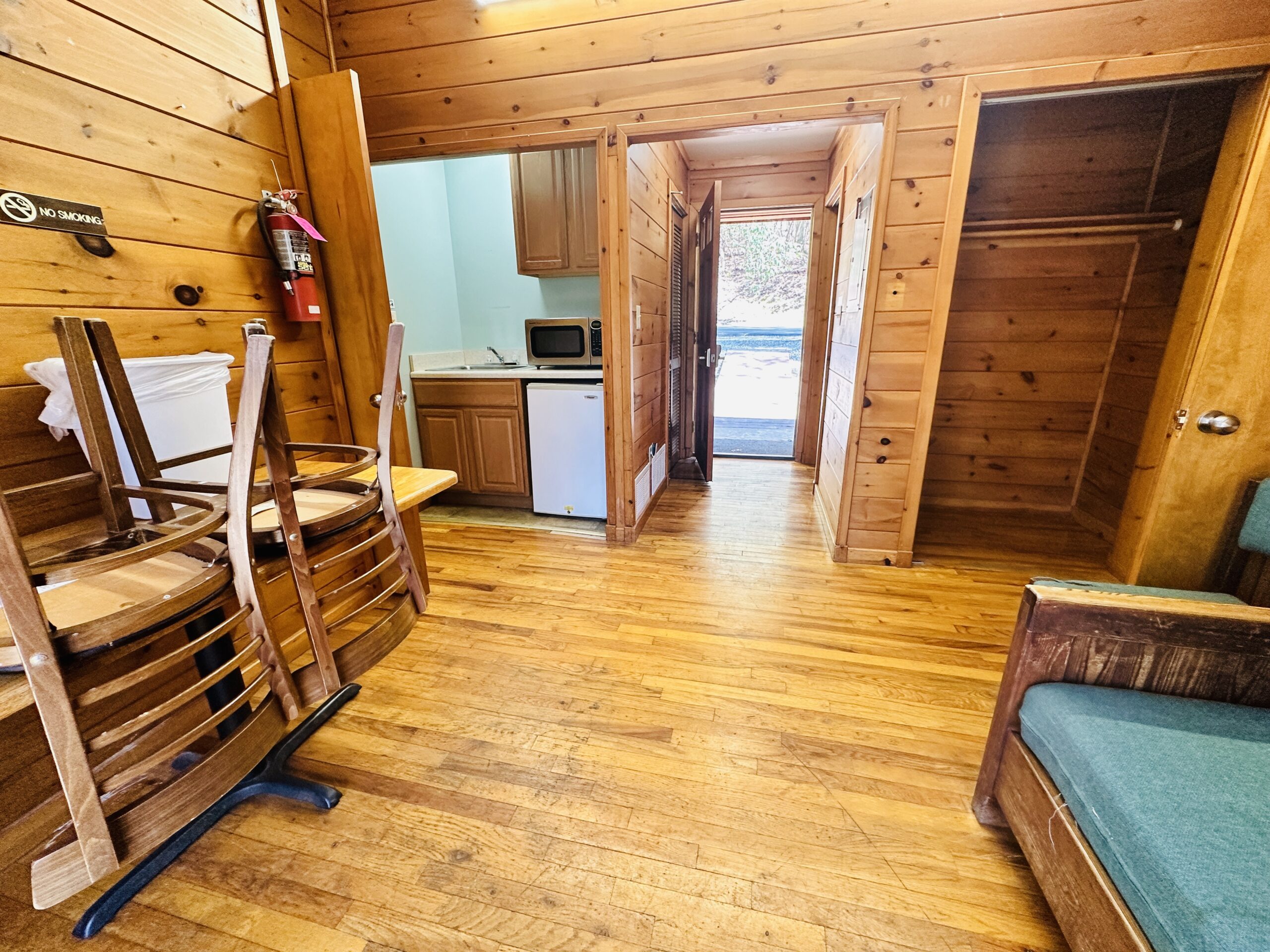 1 Cabin Suite: Our Cabin Suite offers a comfortable kitchenette, living and dining area complete with 2 burner stove top, fridge, microwave, toaster and single cup Keurig.  Sleeps 2 guests in a master bedroom with queen bed and full bath.  Bedding/Linens and Towels Included for Queen Bed.